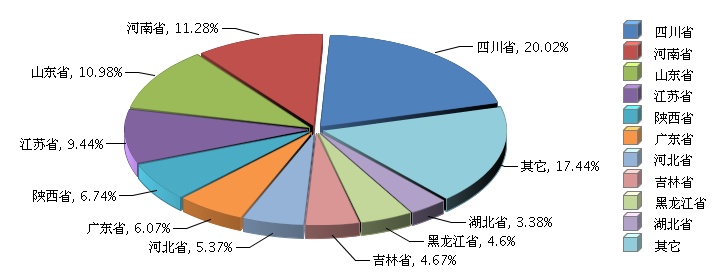 2014年度全國玻璃包裝容器制造行業主營業務收入較去年同期提升9.61%。其中四川、河南、山東三省位列三甲,四川省的主營業務收入占全國比重達到五分之一,河南、山東也都超過十分之一。其他省份中,江蘇、陜西、廣東、河北排名較高。